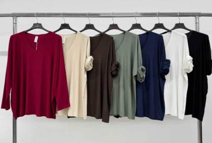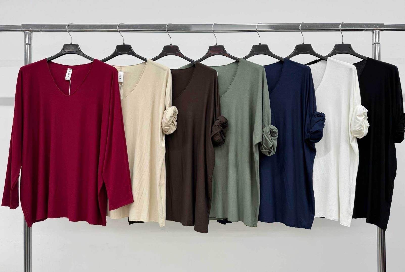 This effortlessly chic top features a modern V-neckline, offering a subtle touch of sophistication. The design comes with full-length sleeves, each loosely rolled up for an added element of casual flair and adaptability. Displayed in an array of rich, versatile hues—from passionate burgundy and classic cream to earthy olive, navy, and timeless black—each color sets a distinctive mood, from confident and bold to serene and understated. Its relaxed fit and gently draped silhouette allow the top to adapt seamlessly to a variety of body types and style preferences. Made from soft, lightweight jersey, it promises year-round comfort, making it ideal for casual, business-casual, or leisurely outings. Minimalist with no overt embellishments, the piece boasts visible topstitching for a touch of artisanal finesse, embodying quiet luxury with its clean construction. Suitable for women who value versatility, timeless style, and effortless layering possibilities across multiple seasons.