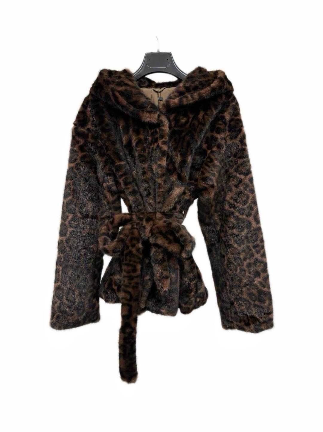 This striking faux fur jacket features a generous hooded collar that envelopes the neckline in plush warmth and adds a chic, modern twist. The long sleeves provide both style and coverage, seamlessly integrating with the tailored silhouette. Dominated by a dark brown leopard print, the color palette evokes a mood of wild sophistication and fierce self-confidence, making it a statement piece for anyone seeking to express personality through fashion. This jacket is ideal for upscale casual outings, fashion-forward urban adventures, and creating show-stopping evening ensembles. Versatile enough to enhance various layered looks, it transitions effortlessly from day to night. The garment appeals to women aged 25–45 who appreciate luxury, bold prints, and are drawn to eco-conscious yet trend-driven lifestyles. Perfectly suited for cold and transitional climates, its faux fur construction is both warm and animal-friendly. Designed for the premium market, it blends contemporary streetwear with a timeless, glamorous edge. Ornaments include a matching self-tie belt to cinch the waist and highlight a fitted, feminine hourglass silhouette. The jacket is hip-length, providing substantial coverage without bulk, and visible seams accentuate the artisanal finish. Handcrafted details and precise tailoring underscore both style and durability, making this a cherished wardrobe investment.