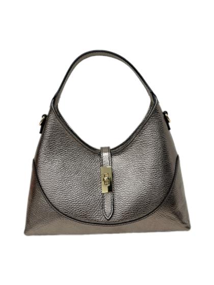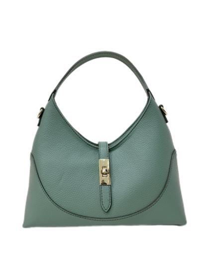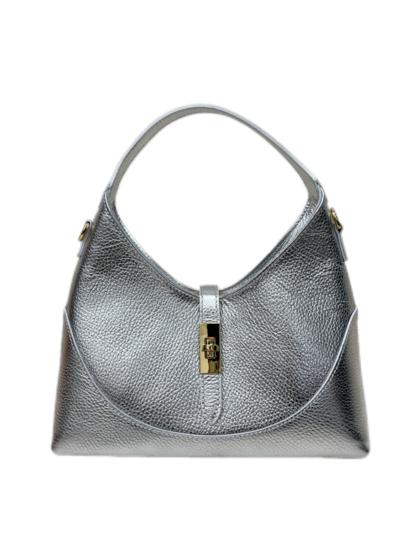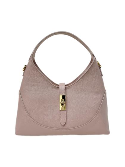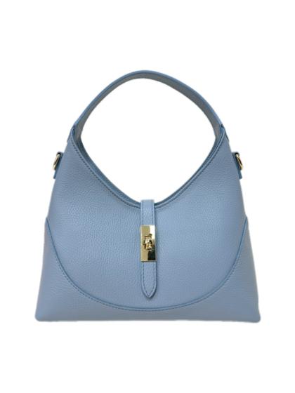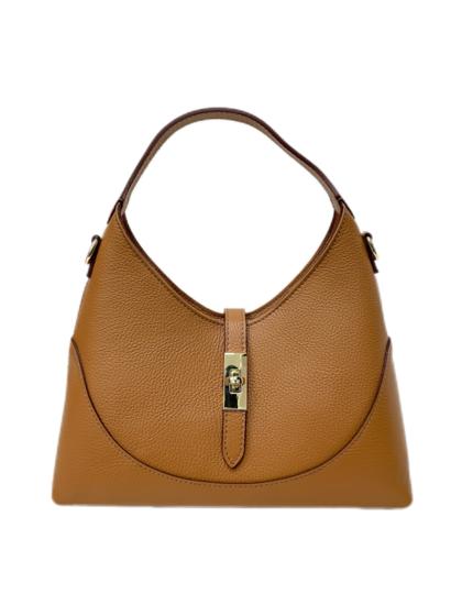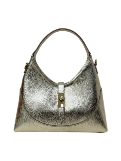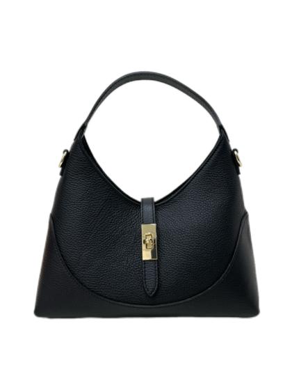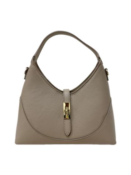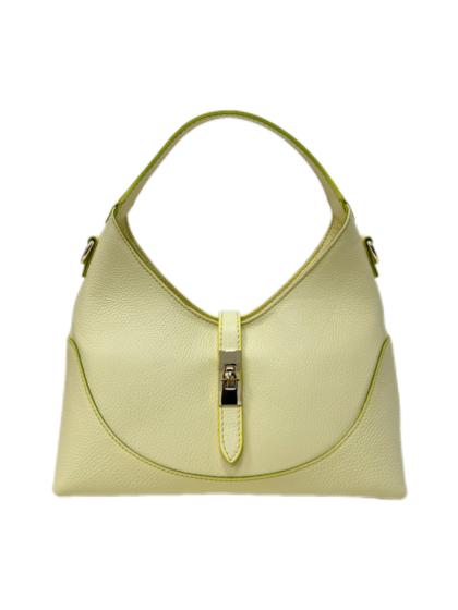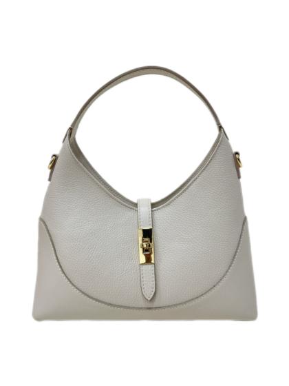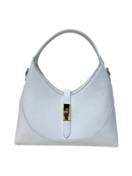This elegant Italian hobo bag showcases a minimalist, sculptural silhouette with a gently curved top handle for comfortable shoulder wear. Crafted in premium white pebbled leather, its dominant hue radiates purity and sophisticated composure, enhancing any ensemble with a touch of modern refinement. Designed for versatility, the bag seamlessly transitions from daytime professional settings to evening social occasions, making it ideal for both business attire and smart casual looks. The gold-toned turn-lock closure at the front introduces a luxurious accent and secure functionality. A mid-sized profile offers ample space for daily essentials, while expert topstitching and seamless panel construction highlight artisanal Italian craftsmanship. The clean, structured exterior, with subtle curves and no excessive embellishments, appeals to women aged 25–45 with a taste for premium, timeless accessories and an active, cosmopolitan lifestyle. Best suited for all-season, urban climates, the design is both enduring and emblematic of elevated, everyday luxury.